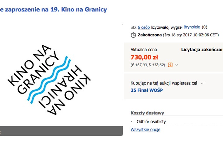 Na 730 zł wycenione zostało podwójne zaproszenie na 19. Kino na Granicy oraz zaproszenie na kolację z dyrektorkami KnG! Dziękujemy wszystkim za udział w aukcji, z której całkowity dochód przekazany został na rzecz Wielkiej Orkiestry Świątecznej Pomocy, a dokładnie na ratowanie życia i zdrowia dzieci na oddziałach ogólnopediatrycznych oraz na zapewnienie godnej opieki medycznej seniorom. Więcej